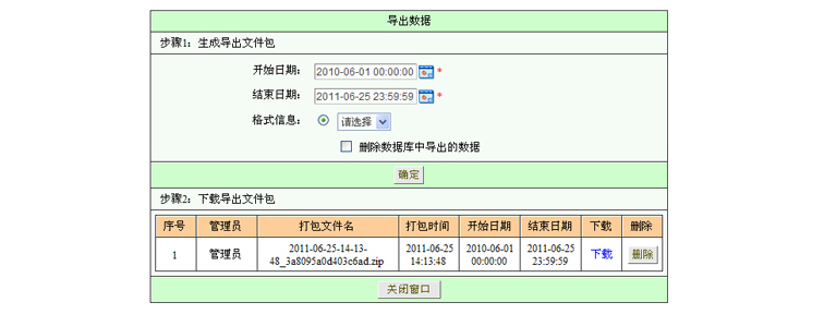 1) 生成导出文件包:设定“开始日期”和“结束日期”及“格式信息”(设定只生成此格式的相关信息)