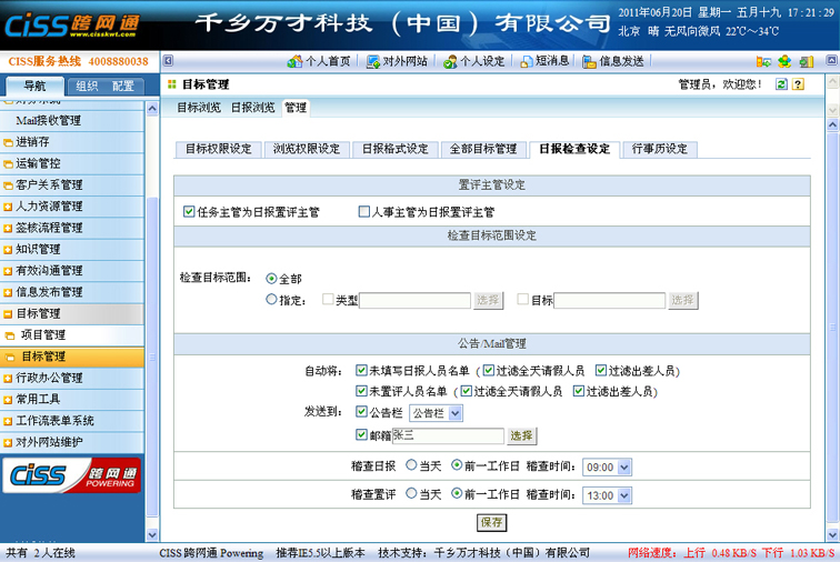 1、  设定置评主管,勾选“任务主管为日报置评主管”,则从当前任务开始,向上每一级任务的负责人都能够置评该任务的日报,如勾选“人事主管为日报置评主管”,则日报的提交者,在人事管理的组织架构中所属部门开始,向上每一层部门主管都能够置评该员工的日报;