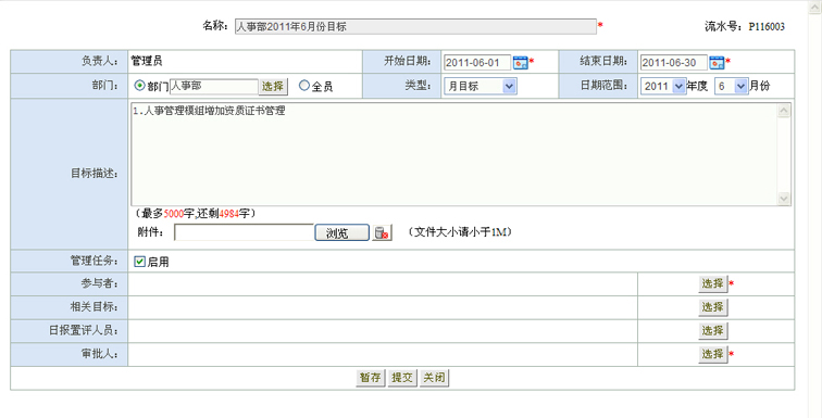 9、  参与者:目标的参与人,后续任务分解时,任务的参与人只能选择目标的参与人;