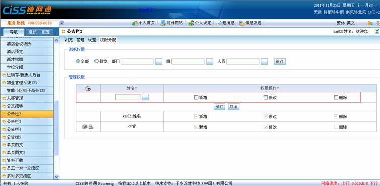 1、  浏览权限:新开通的公告栏模组,浏览权限默认为“全部人员”;