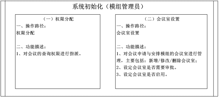 初次使用会议申请与安排模组时,模组管理员可以看到的是【会议申请】、【会议查询】、【会议纪要】、【权限分配】四个Tag。模组管理员首先需要在【权限分配】Tag下对模组进行初始化,主要包括: