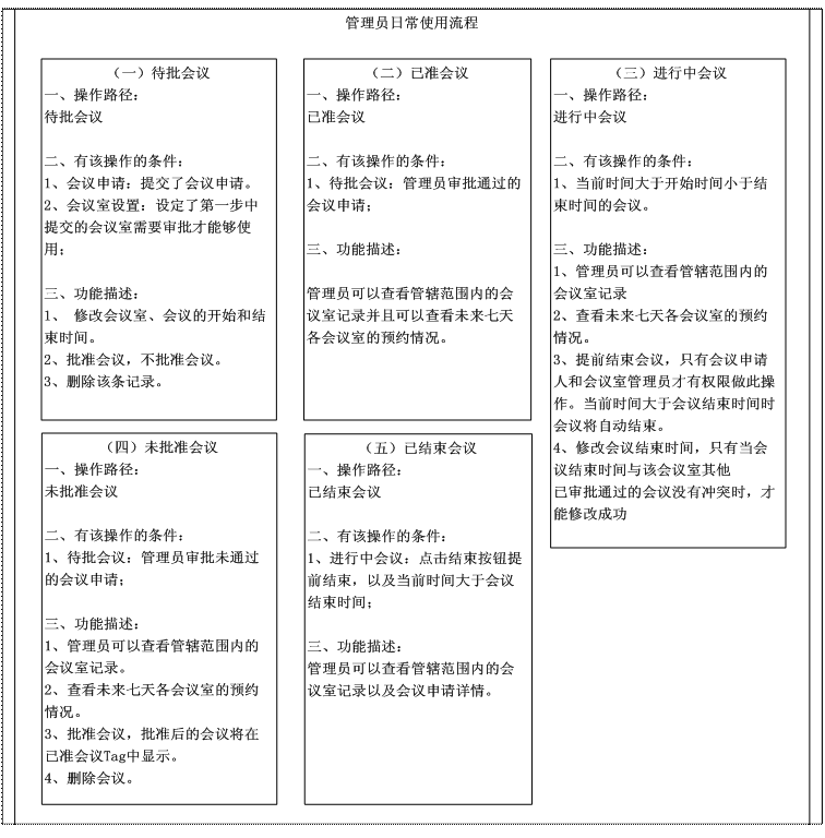 管理员日常使用过程中主要用到的是【会议管理】Tag,在该标签下管理员可以对等待批准的会议、已经审批通过的会议、进行中的会议、未批准的会议、已经结束的会议进行审批、修改、删除、结束等操作。