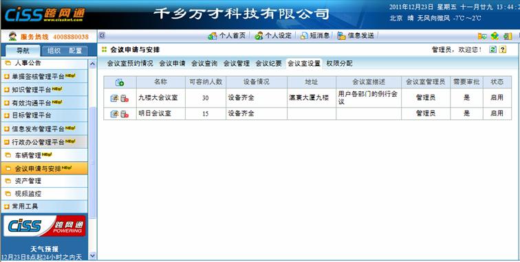 管理员可以将企业拥有的会议室添加到系统中,并填写会议室名称、可容纳人数、设备情况、会议室描述,还可为每个会议室分配一个会议室管理员,设置该会议室是否需要审批才可以使用,以及会议室的状态(启用还是停用)。