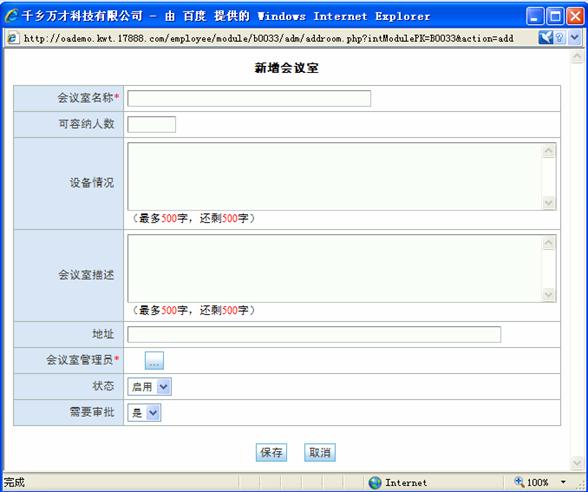 模组管理员可以点击“新增”图标进入新增会议室页面,如下图所示: