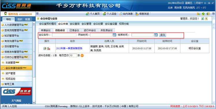 该Tag下显示当前登录者作为会议申请人所提交的申请,同时会议室设置为需要审批但还未被批准的会议。当前登录者可以根据需要在这里通过会议名称、开始时间、结束时间进行信息的查询。