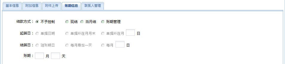 结款方式:分为“不予控制”、“现结”、“当月结”、“账期管理”。