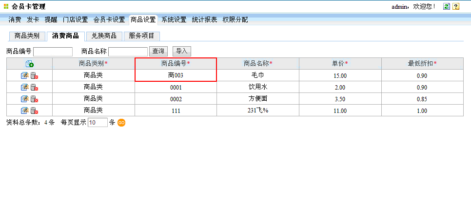 会员管理模组中,商品设置tag下的消费商品栏目中,新增、修改、导入商品信息时,支持商品编号中包含汉字类型。如下图所示:
