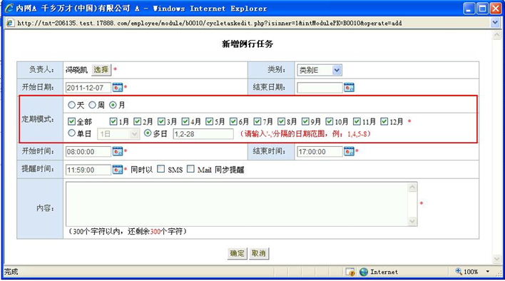 为方便用户设置提醒方式更加便捷、开放,CISS跨网通OA办公系统工作日历模组,新增、修改例行任务时,当“定期模式”为“月”时,可通过勾选“全部”复选框,达到启用所有月份的效果;另外,OA办公系统提醒日期还可手动设置多日,其规则为:单日情况下,每日可用英文逗号“,”分隔,连续多日情况下,可用波折号“-”表示日期的连续性,其后仍使用英文逗号“,”分隔。例如:需“1日、13、14、15日、20日”进行提醒,可输入“1,13-15,20”表达。
