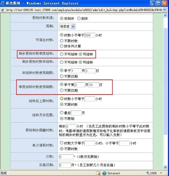 OA办公系统考勤管理模组基本规则定义,定义假别,当“剩余假别时数季度结转”为“可结转”时: