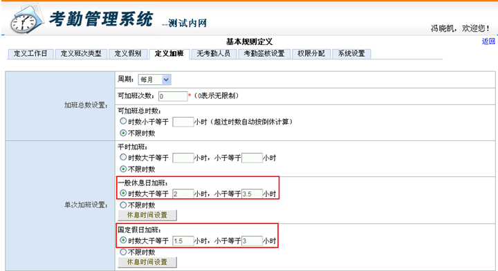 OA办公系统考勤管理模组考勤申请,一般休息日加班、国定假日加班,进行新增、修改时,加班时数(开始时间与结束时间差),受基本规则定义,定义加班,单次加班设置中“一般休息日加班、国定假日加班”所设定的时数限制,有效控制加班时数;下图为设定时数限制页面截图。