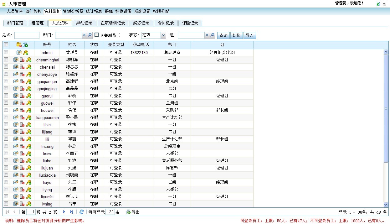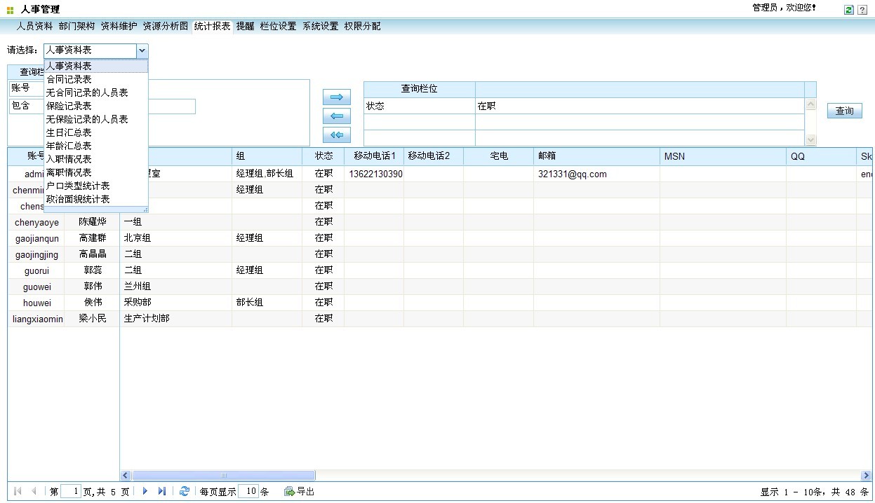 CISS跨网通OA人事管理,用户在部门架构中,可查看部门详细信息且可以将其打印; 增加了多种统计报表,使客户统计数据的来源更全面;权限划分的更加细致入微,能全面照顾到各种用户的需求;还增加了手机版人事管理,用户可以用手机登录查询相关人员信息。