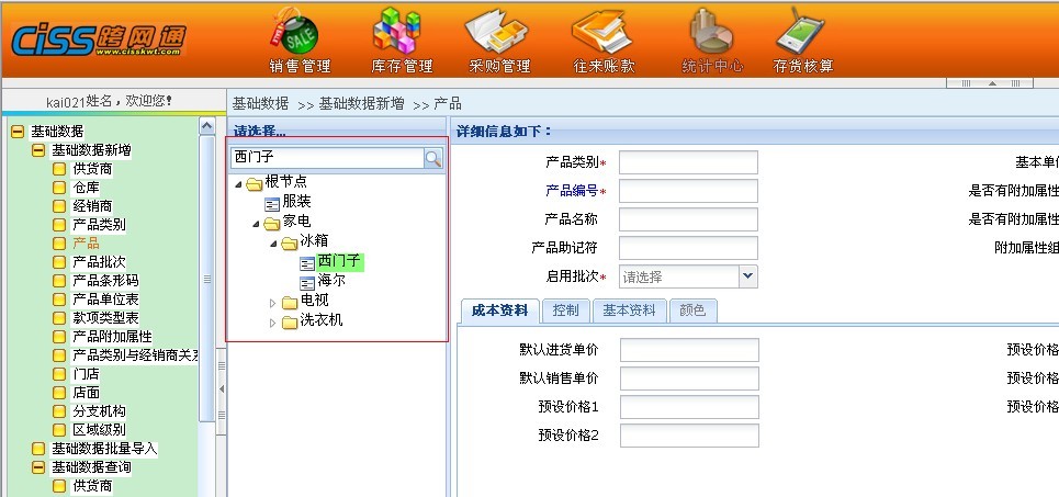 CISS跨网通进销存系统,在产品基础数据新增和修改页面上,为了能方便快捷的找到需要的产品类别,此次增加了查询功能,输入要查询的产品类别名称,模糊匹配,符合查询要求的记录全部展开并高亮显示,供客户选择。如下图: