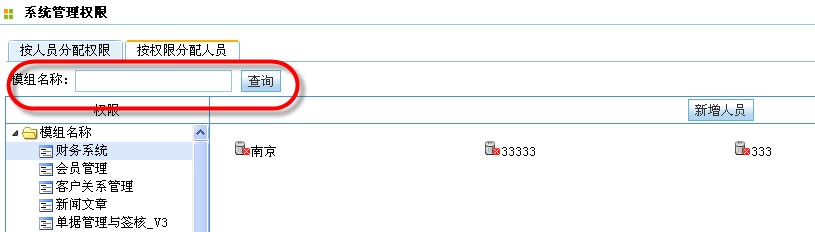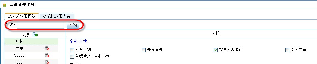 CISS跨网通OA系统,系统管理权限模组3.0,“按人员分配权限”tag查询条件简化为只按“姓名”查询;“按权限分配人员”tag查询条件简化为只按“模组名称”查询。如下图所示: