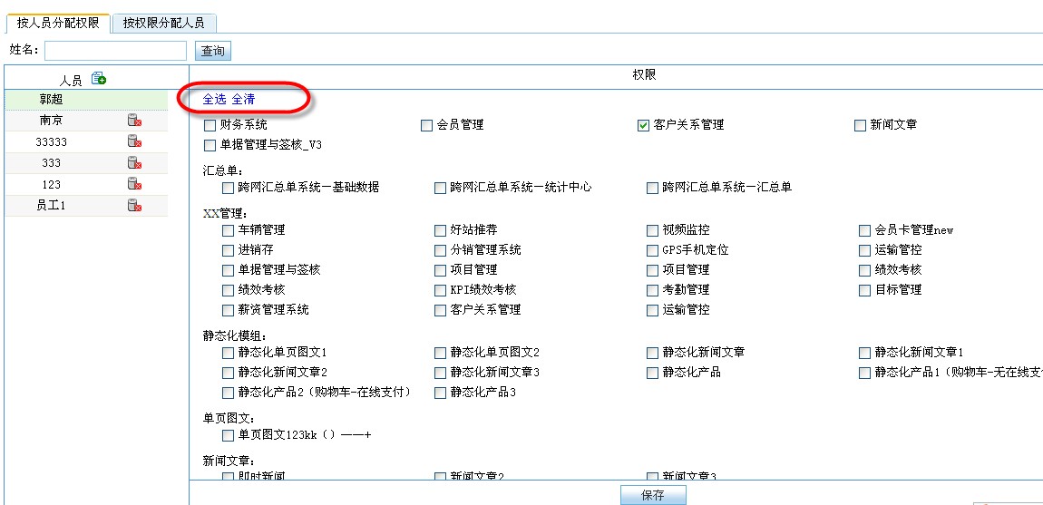 CISS跨网通OA系统,系统管理权限模组升级为3.0,“按人员分配权限”tag下权限区域新增“全选”、“全清”功能。如下图所示: