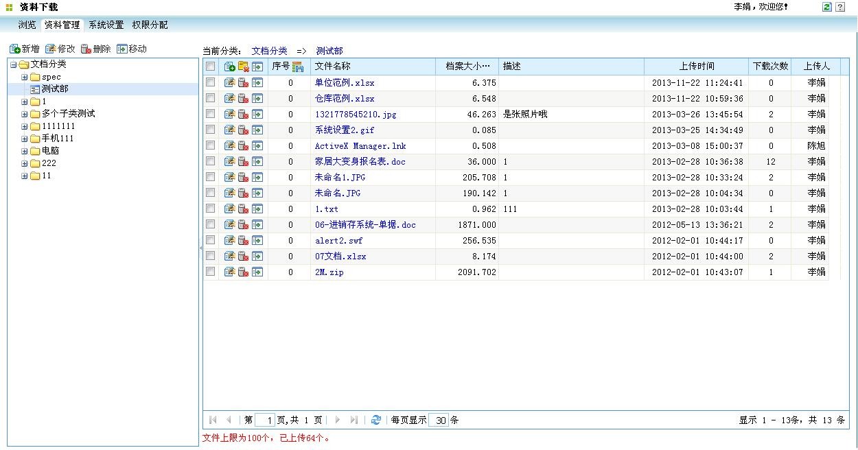 资料下载--资料管理tag下新增批量移动功能,可以选择分类下的一个或多个文件同时移动到其他分类下。界面显示如下图所示: