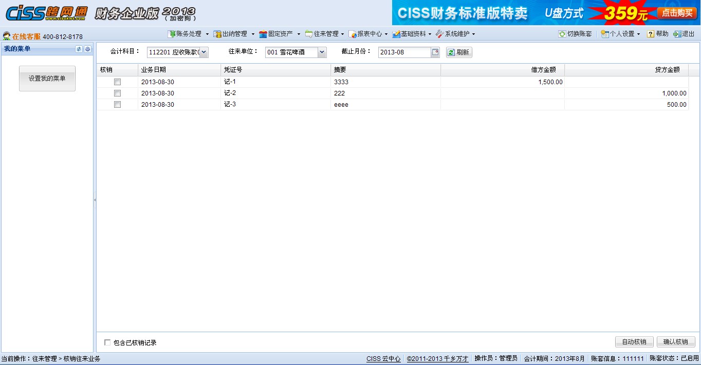 【往来管理】->往来账款核销界面如下: