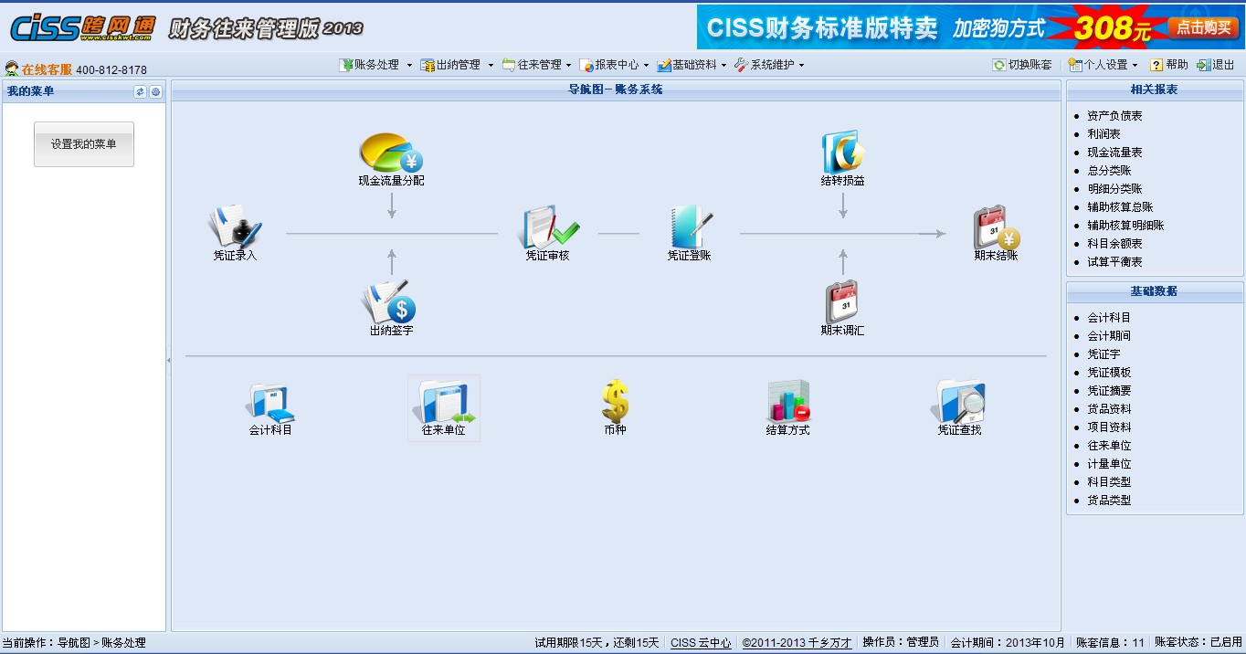 CISS财务往来账管理版主要功能模块包括:系统维护、基础资料、账务处理、出纳管理、往来管理、报表中心。使用方式包括:安装版、密码狗版、u盘版。