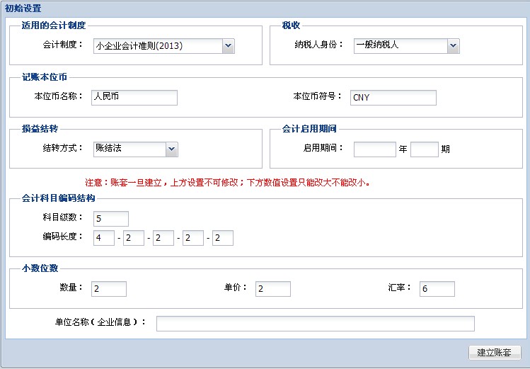 2、初始设置页面,初始会计期间默认为空;