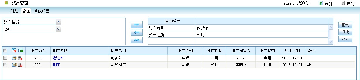 2、管理功能,此功能包含新增资产信息、修改资产信息、查询资产信息、导入资产信息四部分。同时还提供单条件、多条件查询功能,可按资产编号、资产类别、资产性质、资产名称、所属部门、资产保管人、启用日期、资产状态等进行查询。如下图所示: