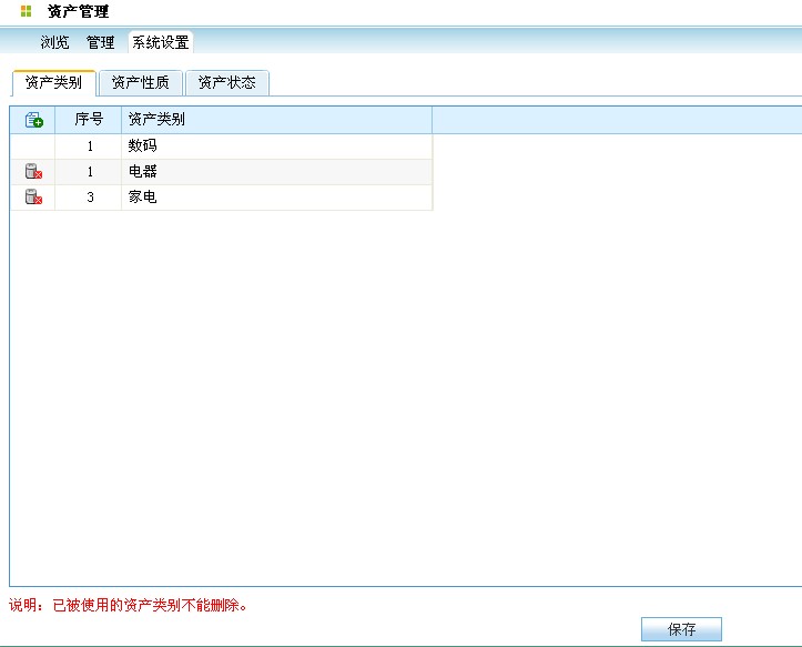 3.系统设置功能,此功能主要是对资产类别、资产性质、资产状态这三项需在此进行设置、删除。注:资产记录使用的资产类别、资产性质、资产状态不能被删除,不显示删除按钮。