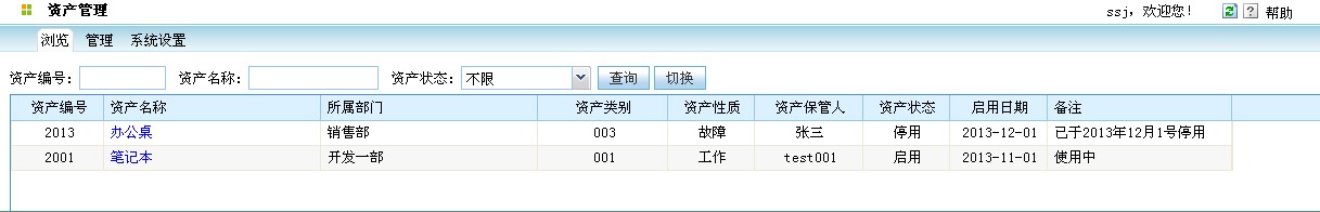 1、 浏览功能。通过浏览,方便企业相关管理人员对企业资产进行全方位了解。同时还提供资产查询功能,可按资产编号、资产类别、资产性质、资产名称、所属部门、资产保管人、启用日期、资产状态等进行查询。如下图所示: