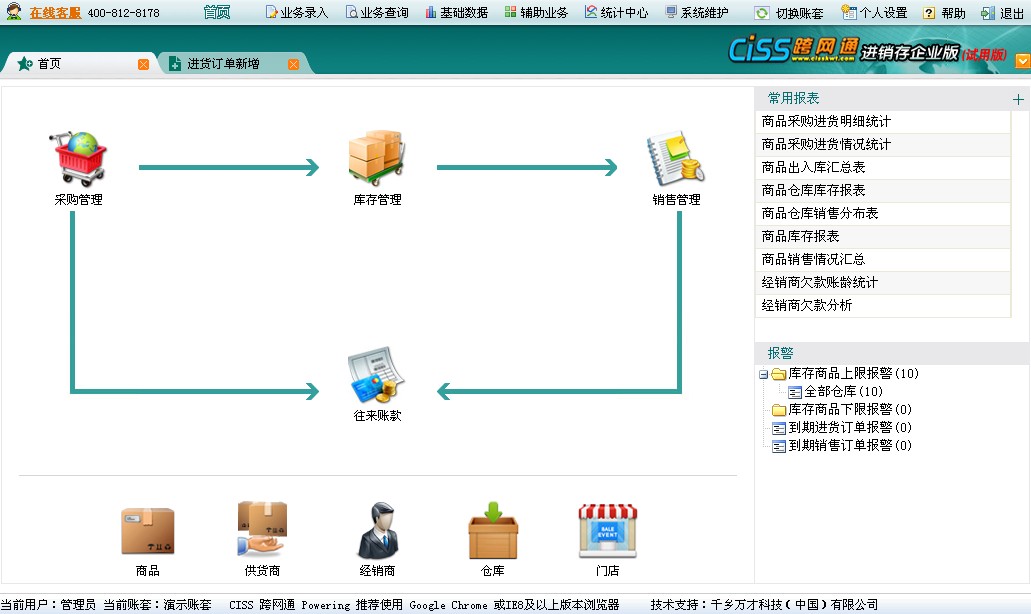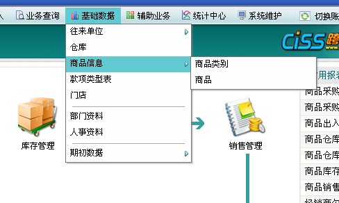 8)基础数据:系统内的各类与业务相关的基础信息,包含往来单位、仓库、商品信息、款项类型、门店、部门资料、人事资料、期初数据。
