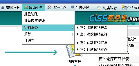 6)辅助业务:核算库存商品成本、结存等核心财务管理,包含批量记账、批量恢复记账、核销业务、月结存、报警。
