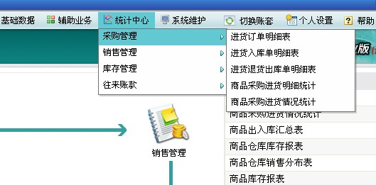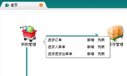 1)采购管理:处理企业订货、入库、退货等采购相关业务,包含进货订单、进货退货出库单、进货入库单。