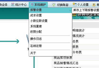 7)系统维护:设置系统相关参数,包含报警设置、成本设置、小数位数设置、系统开账/系统重建、权限分配、操作日志。