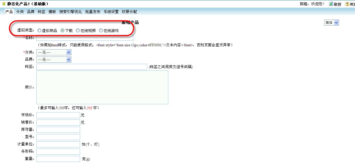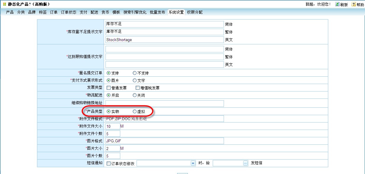 CISS跨网通网站建设,静态化产品模组“系统设置”Tag下新增“产品类型”栏位,可选项有:实物和虚拟,如下图所示: