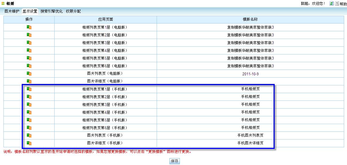 CISS跨网通,网站建设,相册模组,显示设置页,自定义选择模板,新增显示手机版各页应用的模板,并可以更换模板。如图2所示: