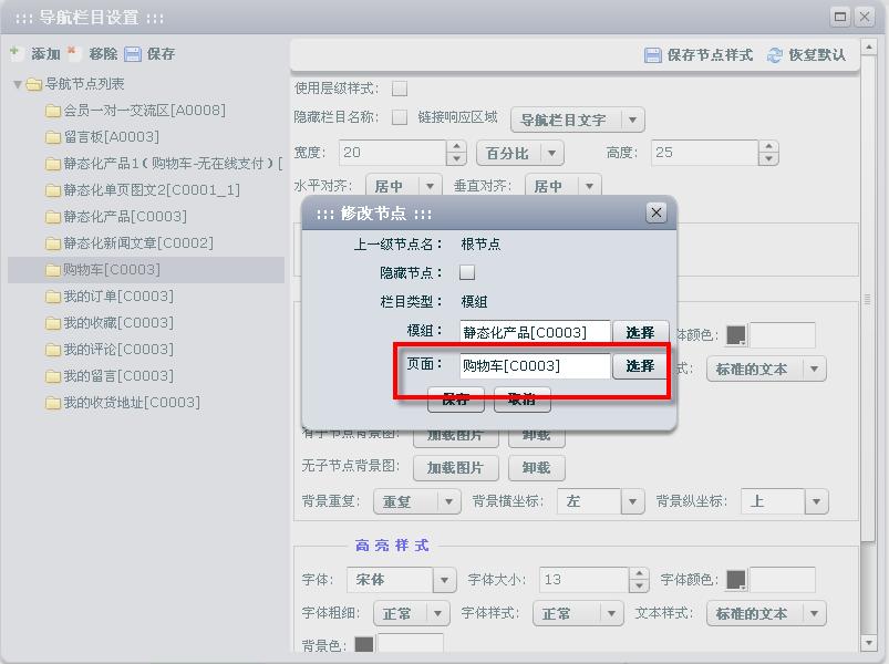CISS跨网通,网站建设DIFC2.0工具,多级导航组件属性“导航栏目设置”页,新增为静态化产品模组的购物车、我的订单、我的收藏、我的评论、我的留言、我的收货地址六个子页添加导航栏目的功能。如图1所示: