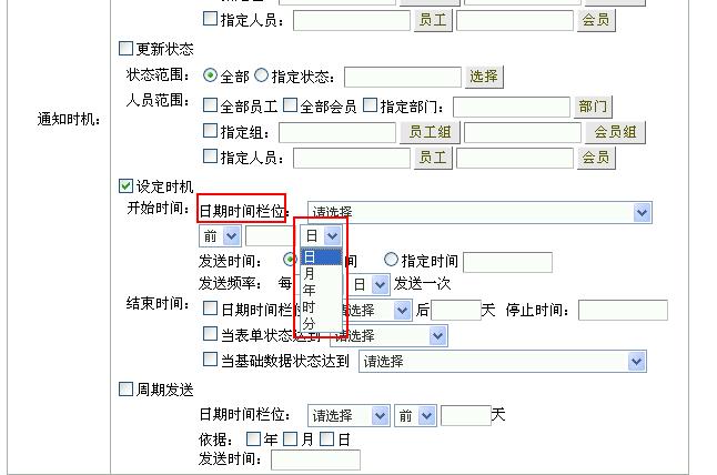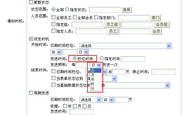 2. 通知机制--设定时机,发送时间增加了“栏位时间”;发送频率的单位增加了月/年/时/分。设定页见下图所示: